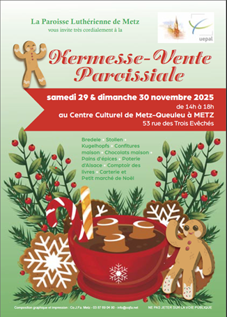 - Samedi 29 et dimanche 30 novembre 2025, Kermesse paroissiale de l’Avent de 14h à 18h au Centre culturel de Queuleu